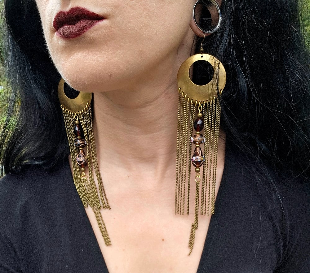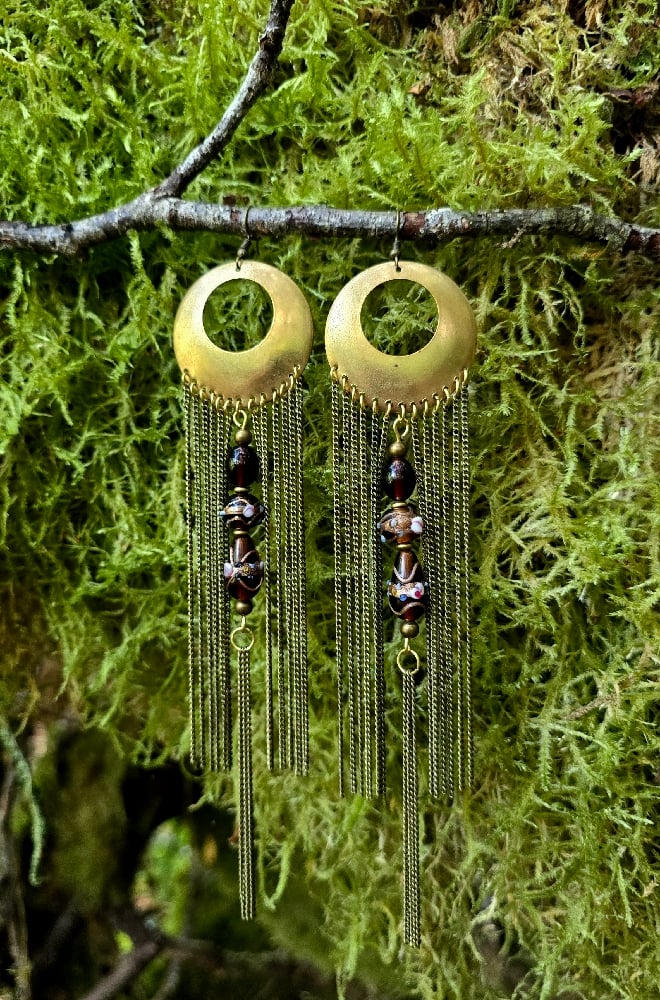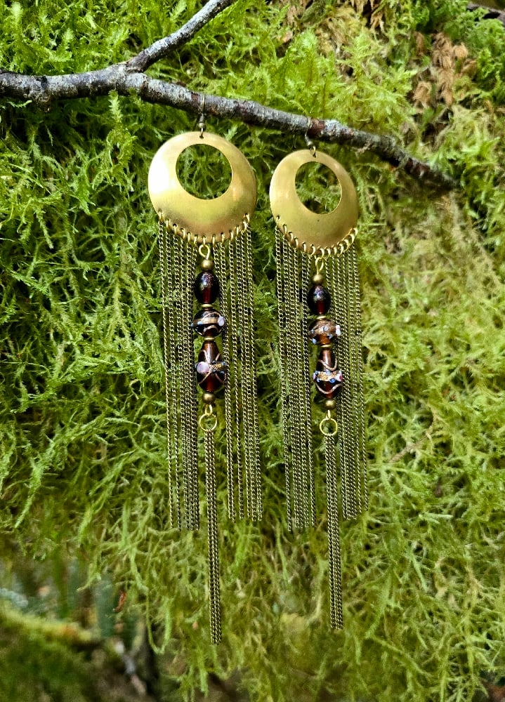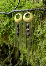 Brass chain fringe earrings featuring brown beads.