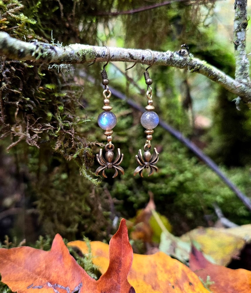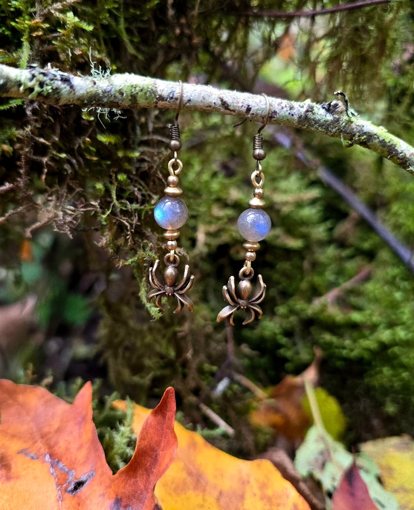 Brass mini spider charms with a labradorite bead. These are what I would consider a lighter weight earring. Can be comfortably worn all day for most people, including those with sensitive ears.